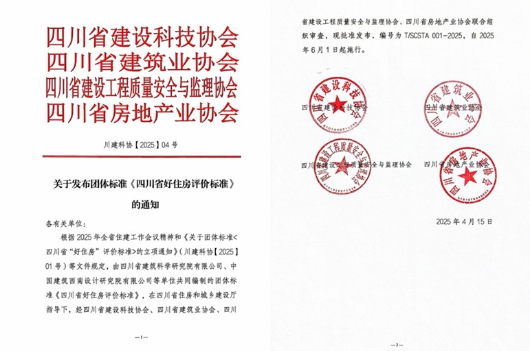 4月15日,《四川省好住房評價標準(T/SCSTA 001-2025)(以下簡稱《標準》)正式發布,將于2025年6月1日起實施。 這是國家標準《住宅項目規范》(GB 55038-2025)發布后,全國首個落地的地方性“好房子”評價標準。 四川建科院,憑借雄厚的科研技術實力和全產業鏈技術服務優勢,成為《標準》的主編單位,本著以建筑科技賦能人民群眾美好生活,引領建筑產業高質量發展的使命擔當,從調研、起草到意見征集、修訂成稿,全過程、全身心推動《標準》標準編制落地。